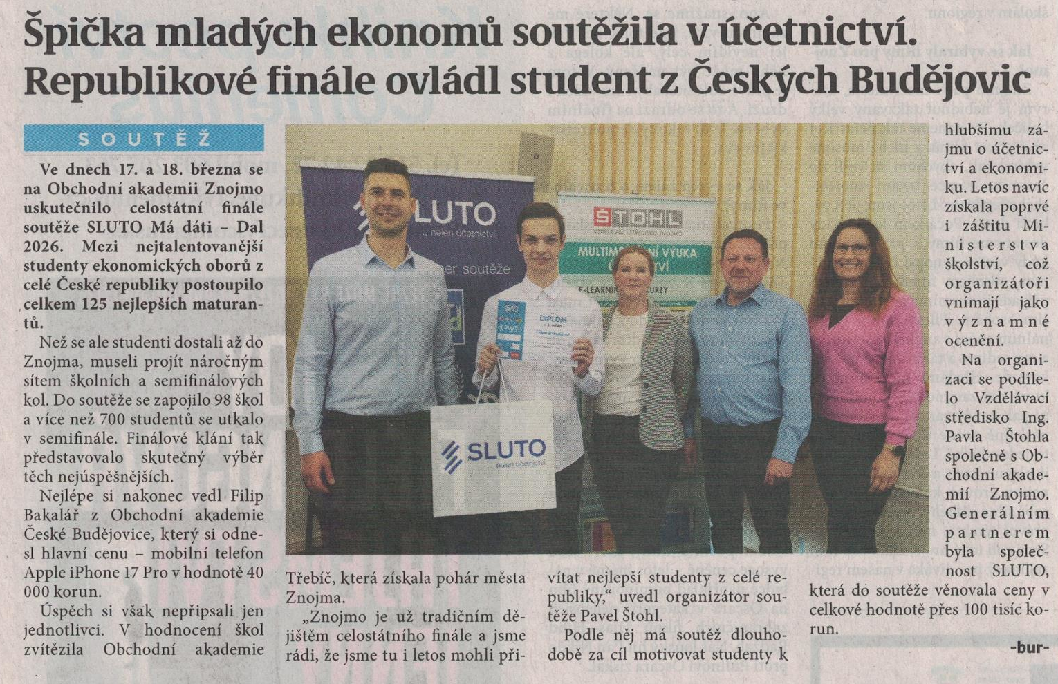 Ve dnech 17. a 18. března 2026 se uskutečnilo na OA Znojmo celostátní finále v účetnictví SLUTO MÁ DÁTI – DAL 2026, kterého se zúčastnilo 125 nejlepších maturantů z celé ČR. Než se studenti dostali až do Znojma, museli projít náročným sítem školních a semifinálových kol. Do soutěže se letos zapojilo rekordních 724 studentů z 98 středních škol.
